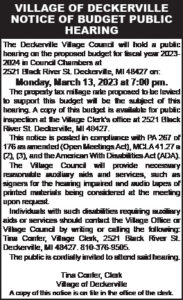 The Deckerville Village Council will hold a public hearing on the proposed budget for fiscal year 2023-2024 in Council Chambers...