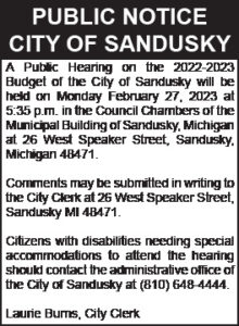 A Public Hearing on the 2022-2023 Budget of the City of Sandusky will be held on Monday February 27, 2023...