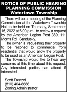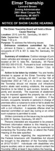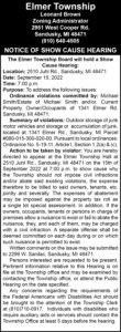 The Elmer Township Board will hold a Show Cause Hearing:Location: 2510 Juhl Rd., Sandusky, MI 48471Date: September 15, 2022Time: 7:00...